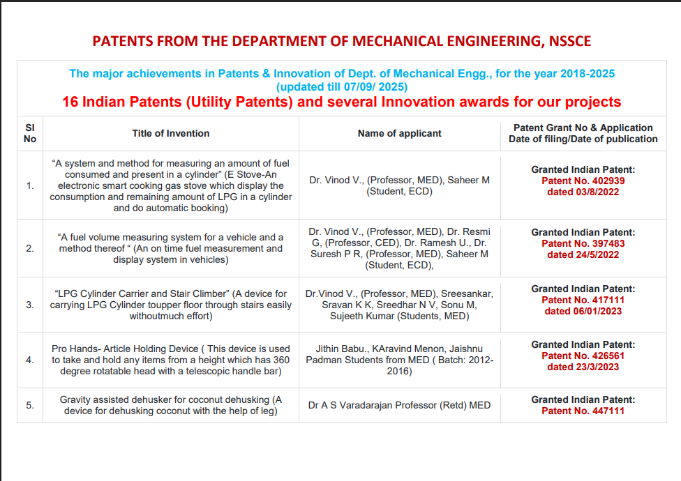 The major achievements in Patents & Innovation of Dept. of Mechanical Engg., for the year 2018-2025
