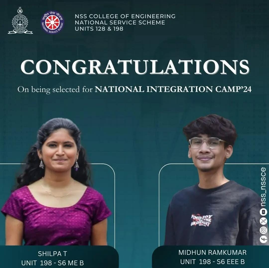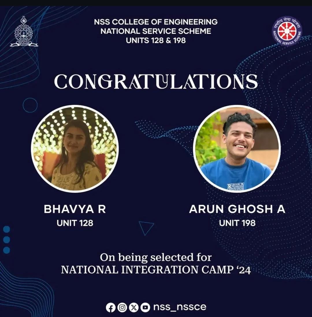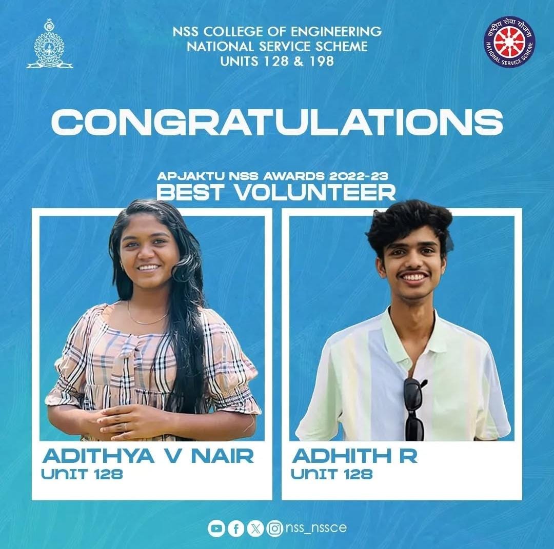 NSS Units 128 and 198 of NSS College of Engineering (NSSCE) actively engage in various social welfare activities. NSS Units are further divided into five subunits namely Santhwanam, Pratheeksha, Urja, Unarv, and Samrudhi, each dedicated to specific areas of social service. These subunits work towards different aspects of community welfare and development.